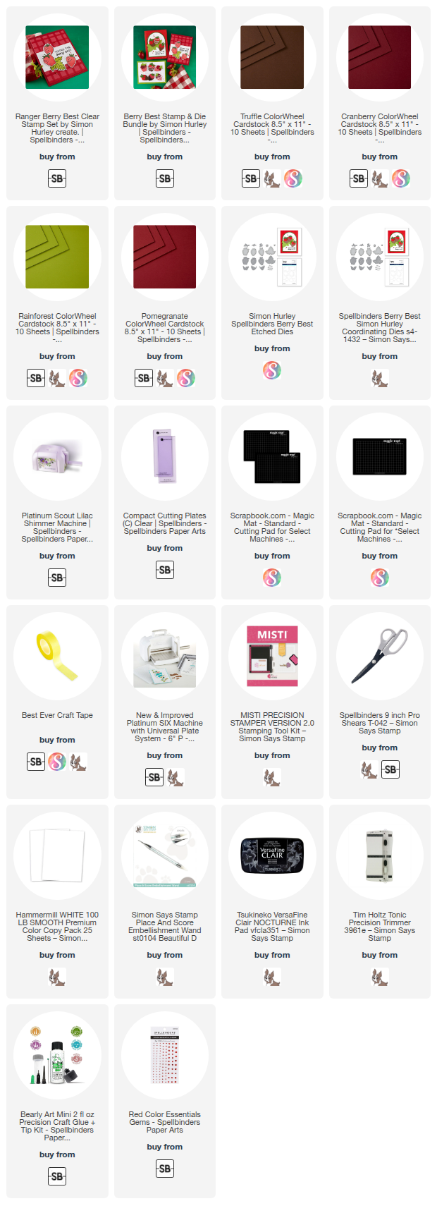 Clicking on a thumbnail link and shopping provides me with a small commission (at no additional cost to you), which supports my website and allows me to continue bringing you new projects and videos. I appreciate your support. Affiliate and product disclosures are found on my disclosure page. All products were personally purchased except for the Spellbinders Berry Best Stamp and Die Combo, which were provided/sponsored by the company. Click on the icons below each product picture to visit my favorite stores.
