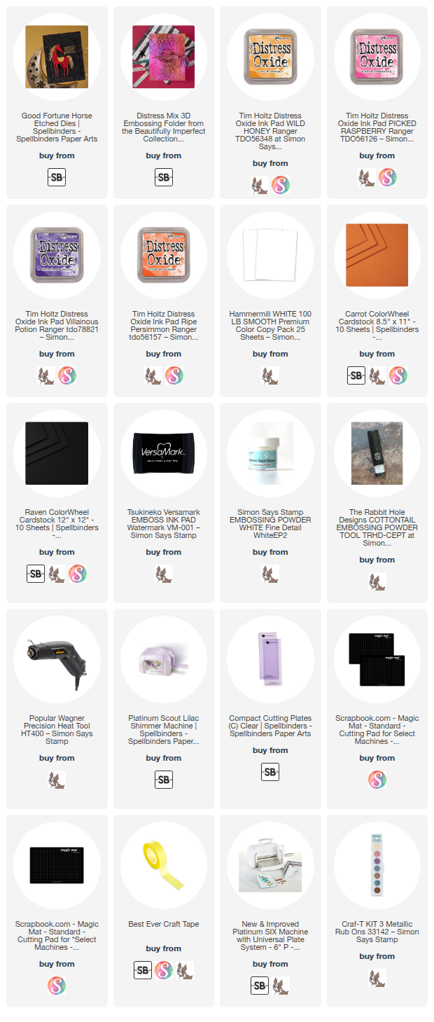 Clicking on a thumbnail link and shopping provides me with a small commission (at no additional cost to you), which supports my website and allows me to continue bringing you new projects and videos. I appreciate your support. Affiliate and product disclosures are found on my disclosure page. All products were personally purchased except for the Spellbinders Good Fortune Horse Stamp and Die set, which were provided/sponsored by the company. I only use and recommend products I love. Click on the icons below each product picture to visit my favorite stores.