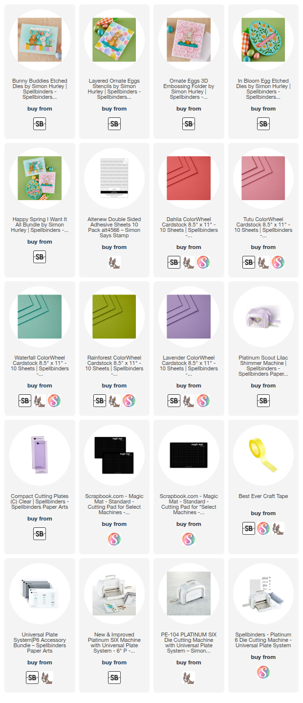 Clicking on a thumbnail link and shopping provides me with a small commission (at no additional cost to you), which supports my website and allows me to continue bringing you new projects and videos. I appreciate your support. Affiliate and product disclosures are found on my disclosure page. All products were personally purchased except for Spellbinders Happy Spring by Simon Hurley Release, which was provided/sponsored by the company. I only use and recommend products I love. Click on the icons below each product picture to visit my favorite stores.