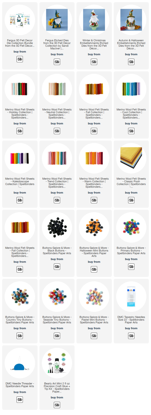 Products used for Woodlands Fergus the Gnome – Spellbinders Felt Stitching Project.