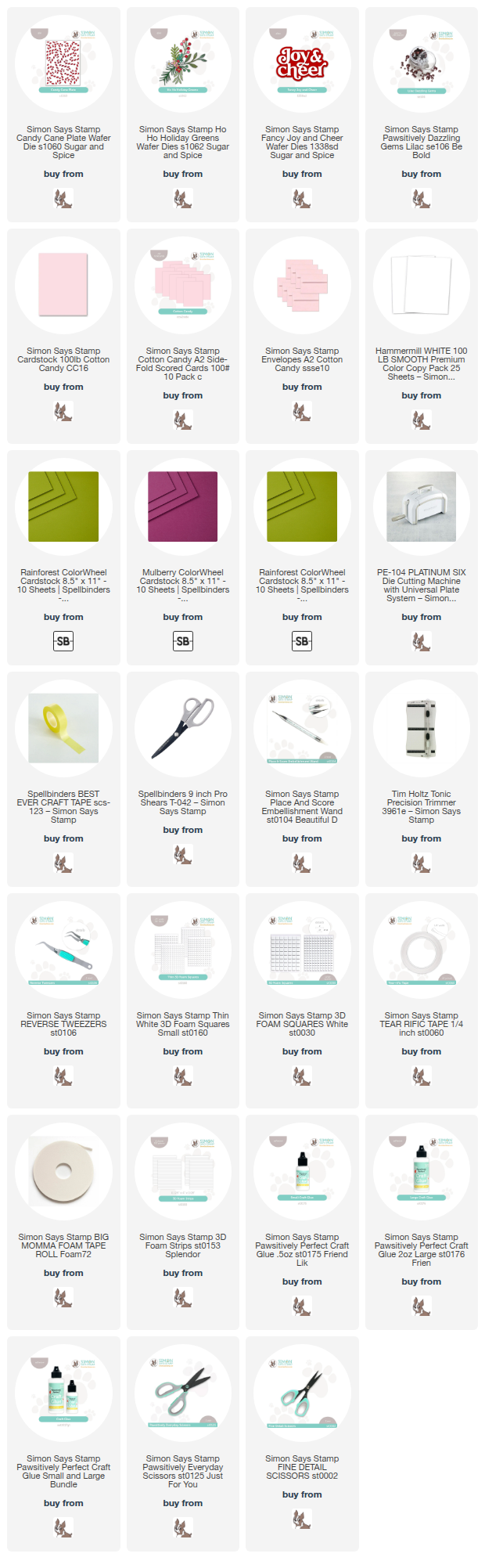 Clicking on a thumbnail link and shopping provides me with a small commission (at no additional cost to you), which supports my website and allows me to continue bringing you new projects and videos. I appreciate your support. Affiliate and product disclosures are found on my disclosure page. All products were personally purchased except for the Simon Says Stamp Sugar and Spice Release products, which were provided/sponsored by the company. I only use and recommend products I love. Click on the icons below each product picture to visit my favorite stores.
