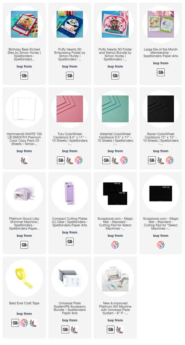 Clicking on a thumbnail link and shopping provides me with a small commission (at no additional cost to you), which supports my website and allows me to continue bringing you new projects and videos. I appreciate your support. Affiliate and product disclosures are found on my disclosure page. All products were personally purchased except for Spellbinders Birthday Bear Dies and Puffy Hearts Stencil and folder, which were provided/sponsored by the company. I only use and recommend products I love. Click on the icons below each product picture to visit my favorite stores.
