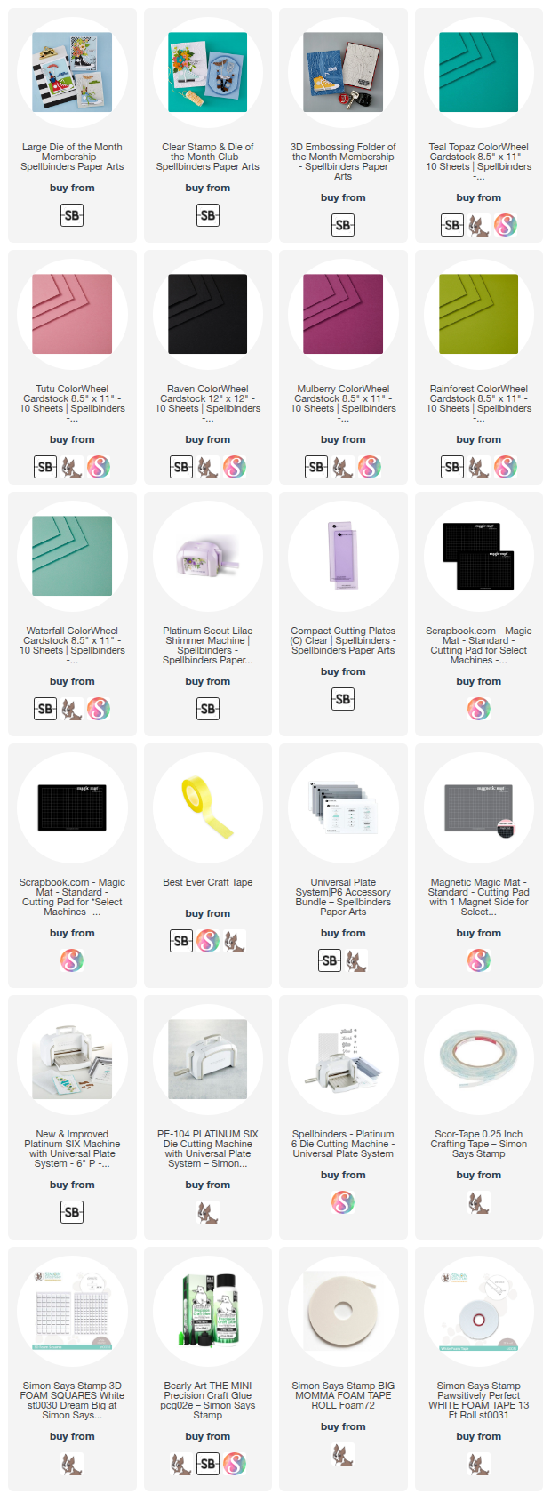 Clicking on a thumbnail link and shopping provides me with a small commission (at no additional cost to you), which supports my website and allows me to continue bringing you new projects and videos. I appreciate your support. Affiliate and product disclosures are found on my disclosure page. All products were personally purchased except for Spellbinders Monthly Club Kits, which were provided/sponsored by the company. Click on the icons below each product picture to visit my favorite stores.