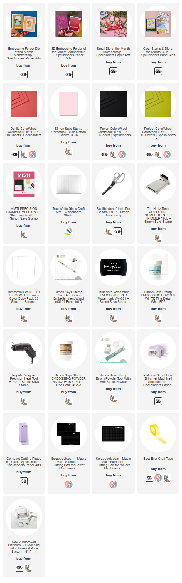 Clicking on a thumbnail link and shopping provides me with a small commission (at no additional cost to you), which supports my website and allows me to continue bringing you new projects and videos. I appreciate your support. Affiliate and product disclosures are found on my disclosure page. All products were personally purchased except for Spellbinders Monthly Club Kits, which were provided/sponsored by the company. I only use and recommend products I love. Click on the icons below each product picture to visit my favorite stores.